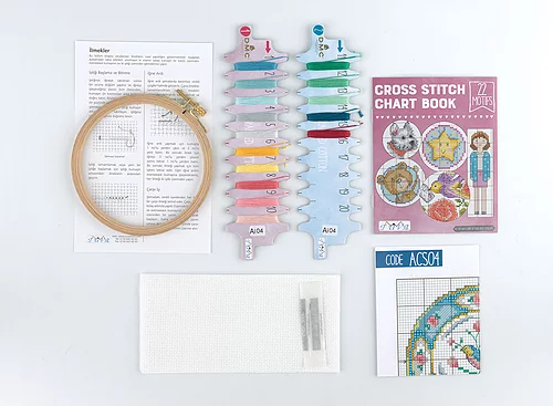 - Kanaviçe kitleri 1 adet nakış iğnesi, 14ct etamin kumaş, renkli ve açıklamalı şema , ahşap kasnak , mini kanaviçe kitapçığı ve DMC Muline nakış ipliklerinden oluşmaktadır