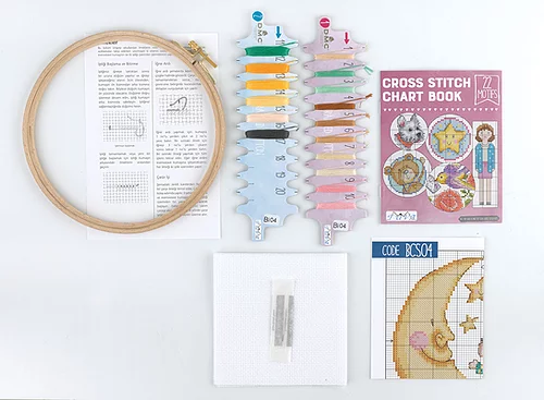 - Kanaviçe kitleri 1 adet nakış iğnesi, 14ct etamin kumaş, renkli ve açıklamalı şema , ahşap kasnak , mini kanaviçe kitapçığı ve DMC Muline nakış ipliklerinden oluşmaktadır