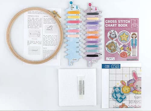 - Kanaviçe kitleri 1 adet nakış iğnesi, 14ct etamin kumaş, renkli ve açıklamalı şema , ahşap kasnak , mini kanaviçe kitapçığı ve DMC Muline nakış ipliklerinden oluşmaktadır